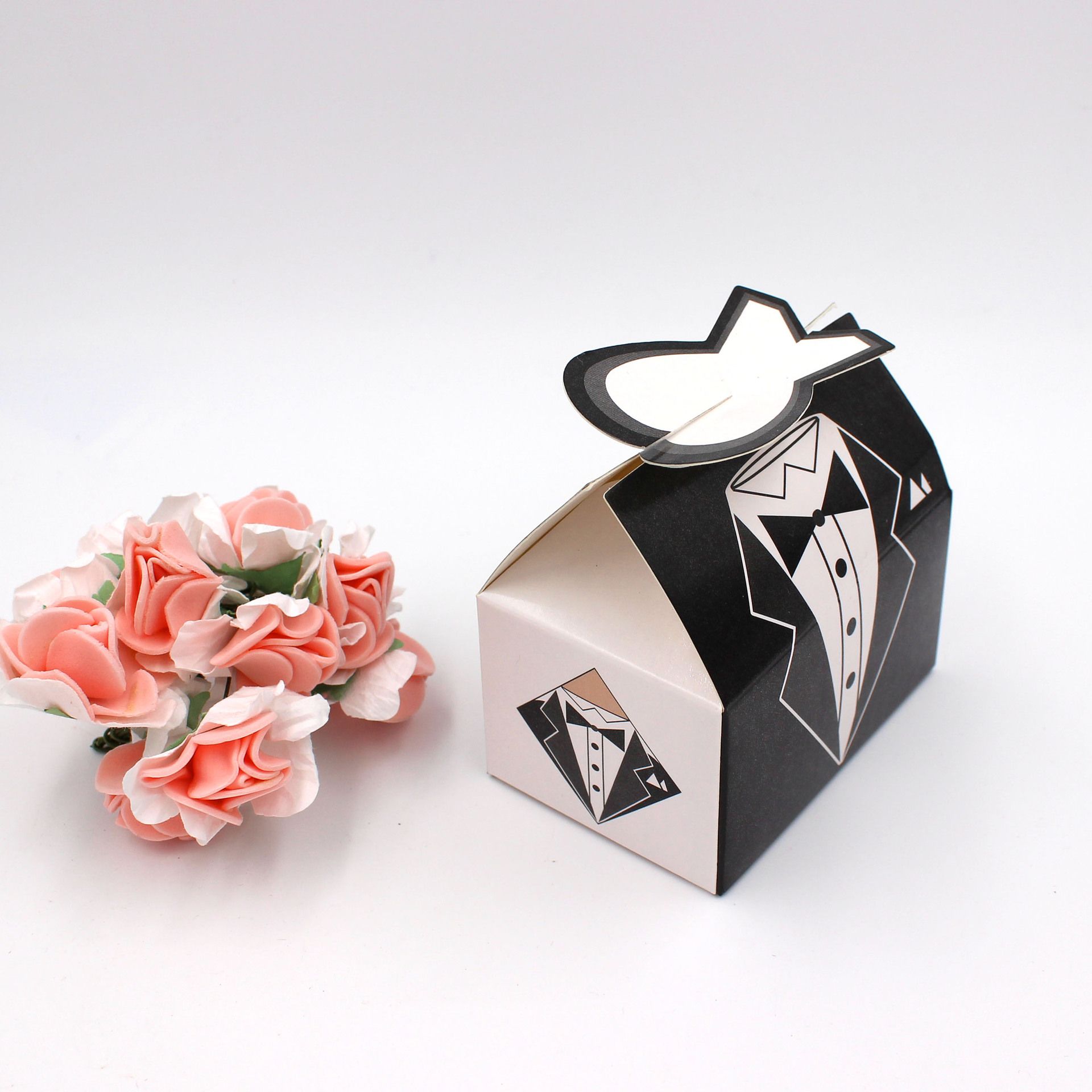 100pcs (50 groom tuxedo boxes +50 bride dress boxes) bridal gift cases groom tuxedo dress gown ribbon wedding favors candy box.